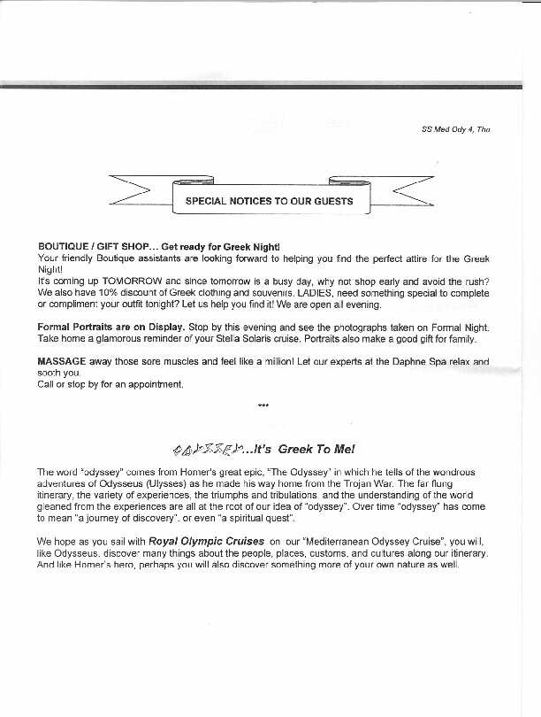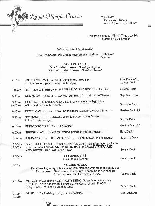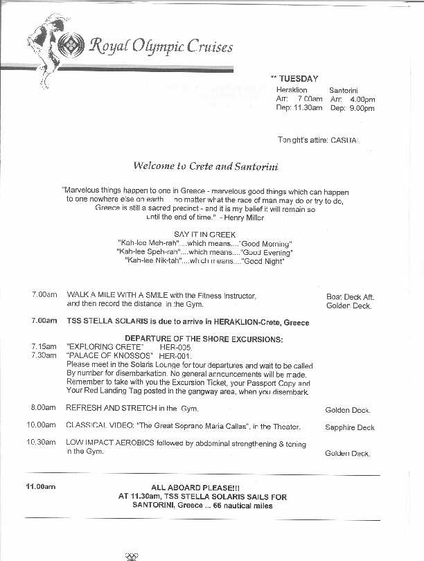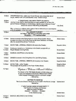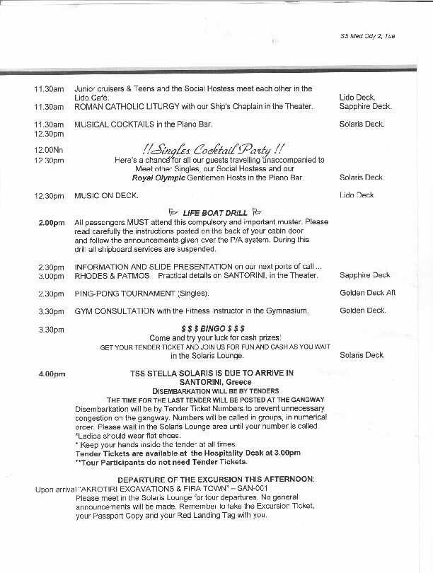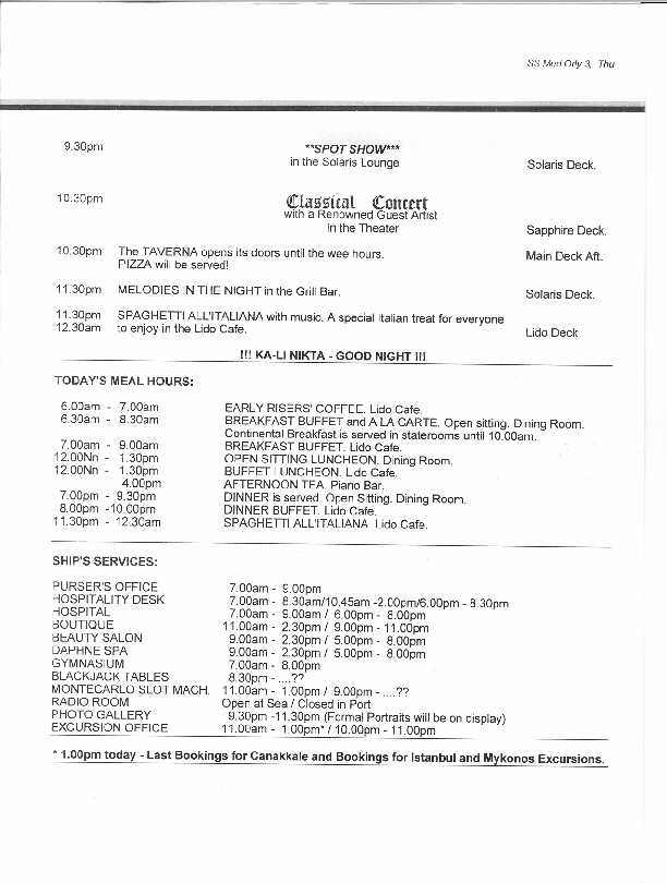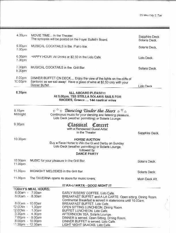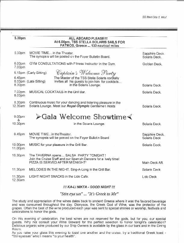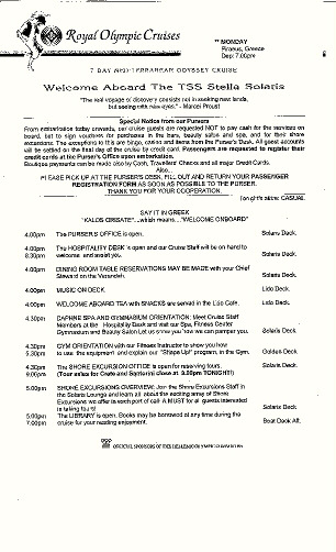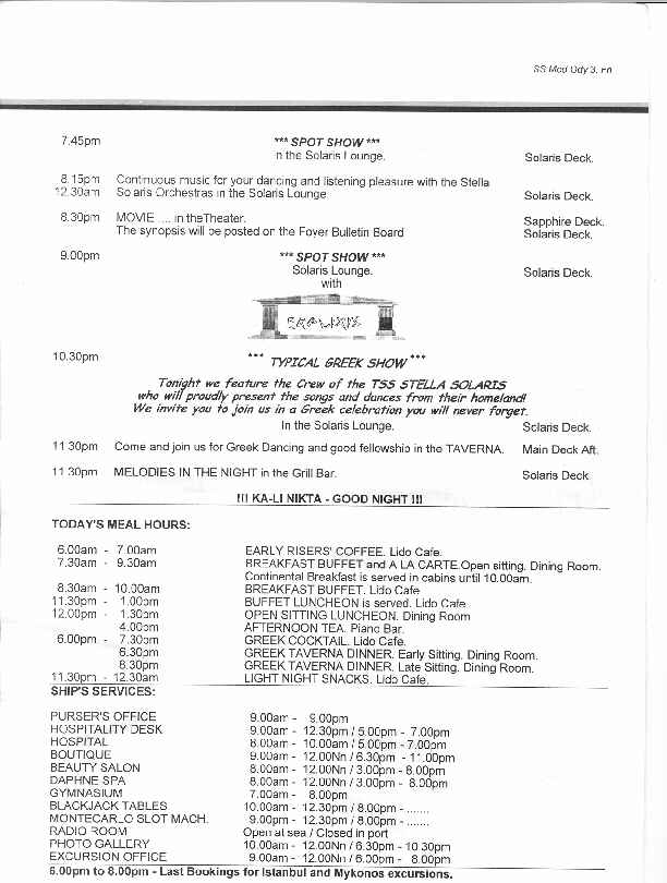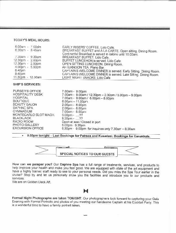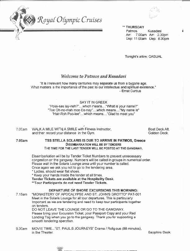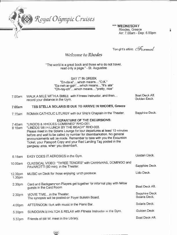We were so hot and tired we took showers and changed. I even unpacked everything. Then we went to the theater at 6:15 p.m. for an orientation. We met Brian and James, Paul the cruise director, and George the excursion director. ( See the plan for the day.)