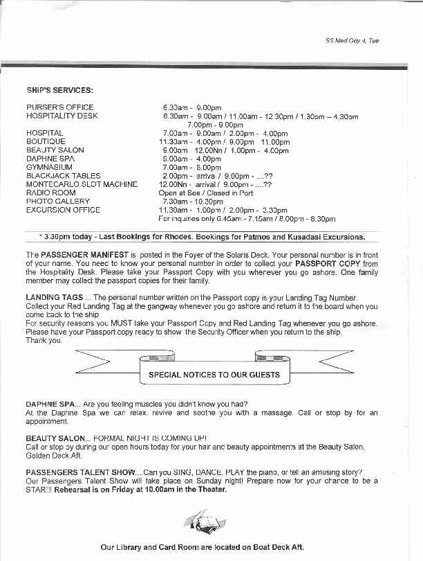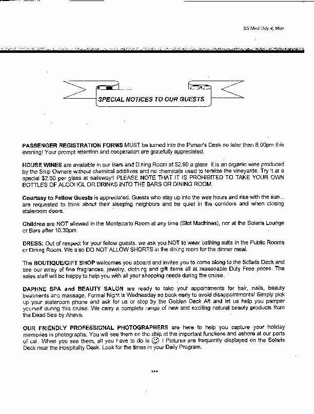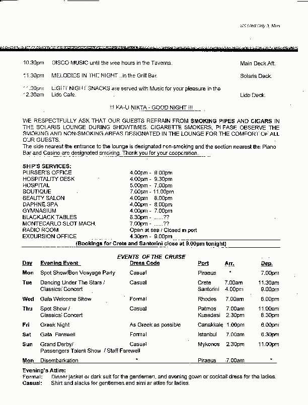 After the meeting was over at 7:00 p.m. we had until 8:30 p.m. for dinner. I had already showered and changed so we turned in our passenger sheet and left our credit card imprint at the Purser's Office.
