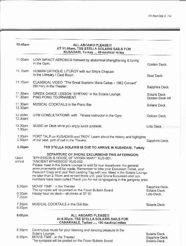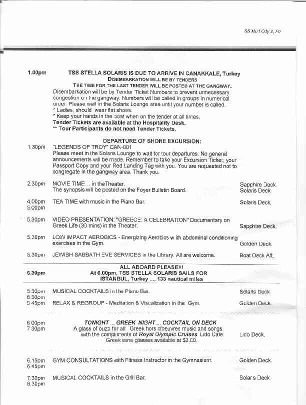 Tonight we went up to the midnight buffet where, it seemed to us, they were serving the leftovers from earlier in the day. The strawberry t art w as delicious. The couple we had dinner with was there, but we sat outside. Mark isn't being very sociable. I signed up for the Rhodes tour tomorrow by myself so I gotta be up by 7:00 a.m. and it's after 12:30 a.m. now.