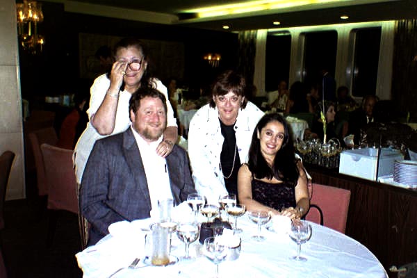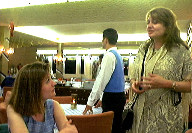 The plane was full. A very nice woman from Texas sat next to me. She didn't want to switch seats with Mark because she recently had a knee operation. But she said she would switch for the meal. So Mark and I sat together for dinner. As it turned out, she never asked for her seat back. She told me later, standing in line at the lavatory, that she could tell Mark and I were in love, and she wanted us to be together. I thanked her and told her she could have the seat back whenever she wanted. But she never did ask for her seat. We bumped into her a couple of times on the ship.